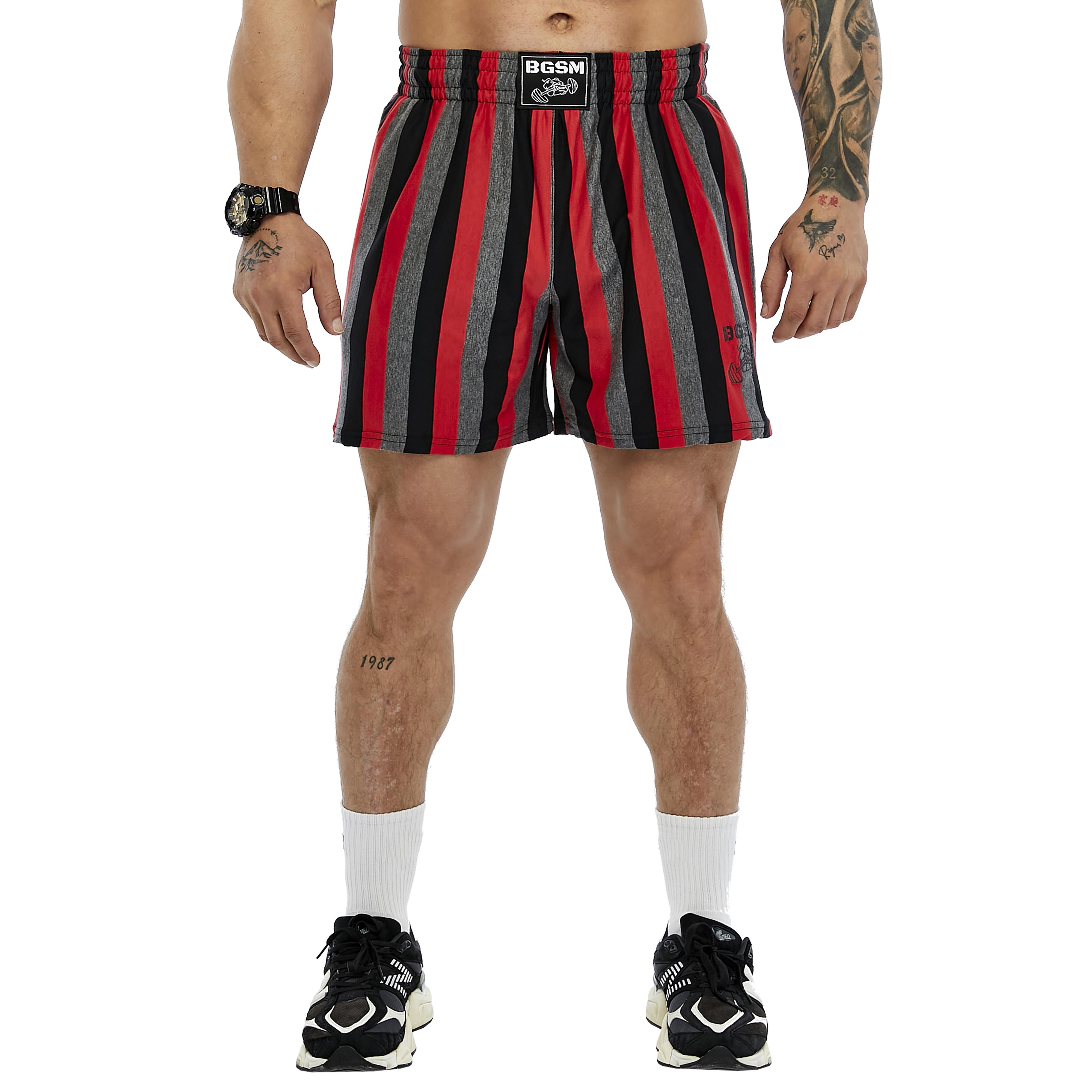 • These BGSM men's gym shorts combine bold style with practical performance for your fitness routine. Featuring eye-catching yellow and black vertical stripes, these athletic shorts make a confident statement whether you're hitting the gym, training outdoors, or engaging in your favorite sport. Crafted from 100% cotton, these lightweight fitness shorts offer natural breathability and comfort during intense workouts. The thin fabric construction ensures optimal airflow to keep you cool when the temperature rises, while the soft cotton material moves with your body through every rep, sprint, and stretch. The convenient lace-up waistband provides a customizable, secure fit that stays in place during dynamic movements. With a extra short length design, these training shorts offer unrestricted mobility for squats, lunges, and leg day exercises. The relaxed fit accommodates athletic builds while maintaining a streamlined silhouette. Perfect for bodybuilders, fitness enthusiasts, and active individuals who appreciate both function and distinctive style in their workout wardrobe.