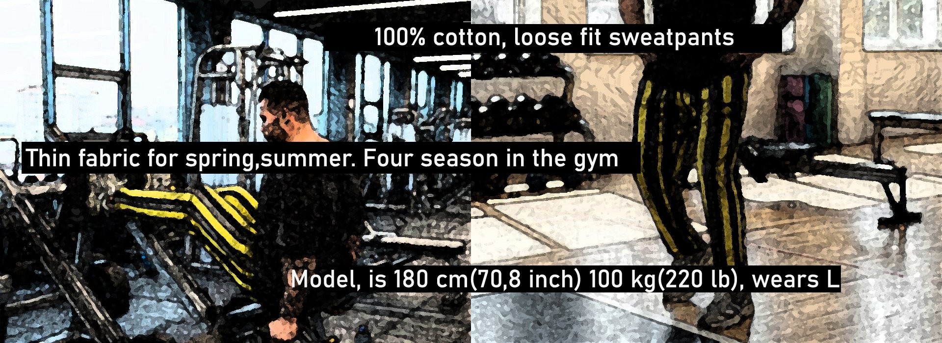 • Spring - summer season. The sweatpants are made from 80% cotton 20% polyester . Thanks to its cotton texture, its breathable structure won't make you sweat in summer and will keep you easy to use for all four seasons in gym.